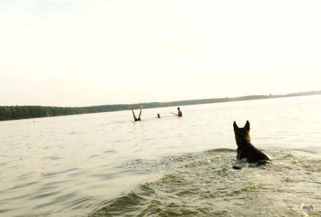 Nie jest łatwo psiakom w te upały. Znalezienie miejsca gdzie mogłyby popływać też nie takie proste. Bo jak już się znajdzie, to zazwyczaj w upalne dni obłożone jest ludźmi, którzy niekoniecznie akceptują psy obok się w wodzie. Na szczęście późnym popołudniem nad wodą zastaliśmy tylko kilku spacerowiczów, i silną ekipę, którą omijałabym z daleka po zmroku na osiedlu, a tu okazali się ,,spoko". Im nie przeszkadzały psy, mi nie przeszkadzał ogrom bluźnierstw jakich używali do porozumienia się między sobą.